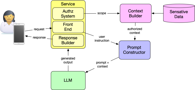 A person begins by expressing intent through an application. The service evaluates that request using its authorization system. The PDP produces a decision, and the PEP enforces it by constraining access to data, producing an authorized scope. Only data within that scope is retrieved and assembled as context. The prompt is then constructed from two inputs: the user's intent and the authorized context. The LLM generates a response based solely on what it has been given.